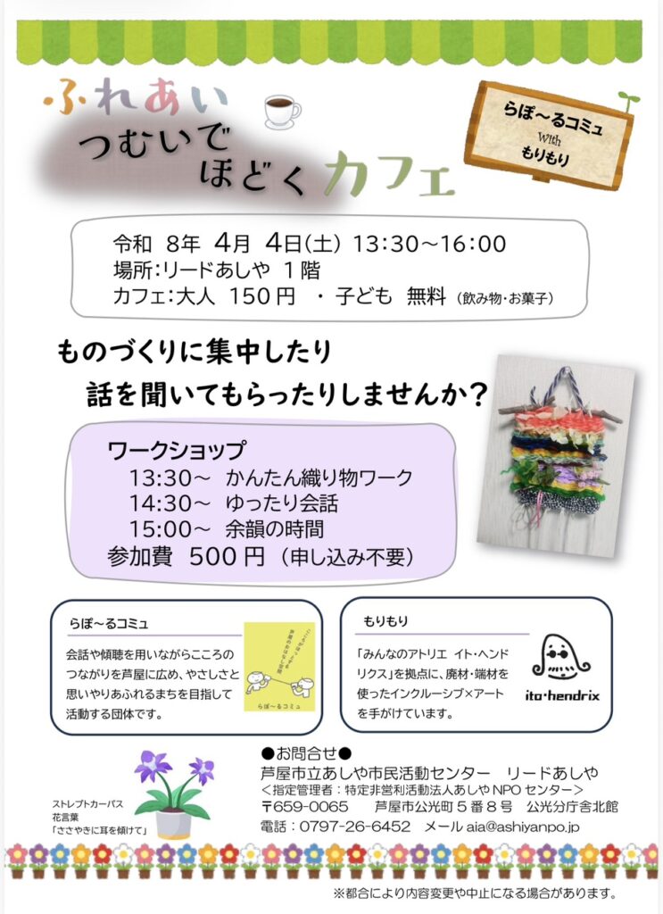 ・2026年4月4日(土)に、リードあしやで『ふれあい つむいでほどく カフェ』を開催いたします。今回は"みんなのアトリエ イト・ヘンドリクス"の、もりもりさんとご一緒に、かんたん織物ワークとゆったり会話をワークショップ形式で実施いたします。簡単なものづくりと心地よい会話で、心が整うひとときになるのではないかと思います。ご参加をお待ちしています。
