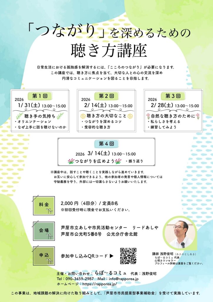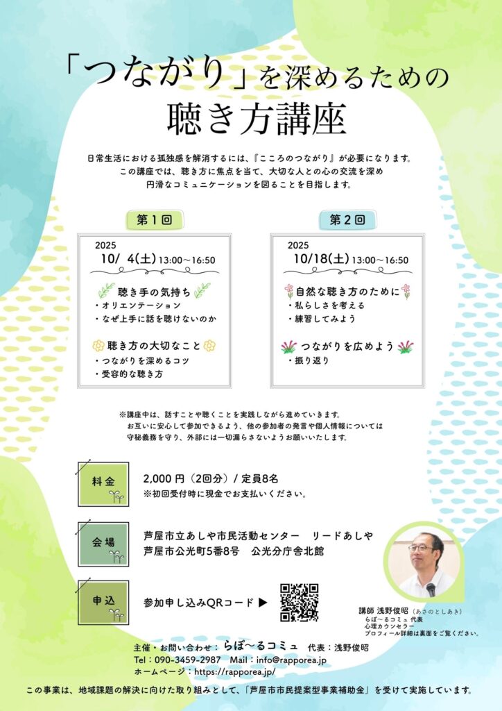 人とのつながりを深めるための話の聴き方について、心理カウンセラーが基礎的な知識をお伝えしつつ、実践を交えながら進めていく講座になります。